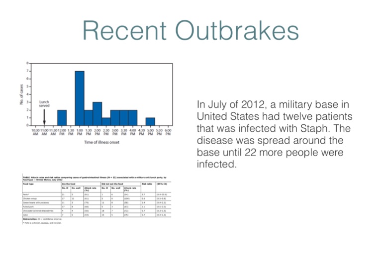 In July of 2012, a military base in United States had twelve patients that was infected with Staph. The disease was spread around the base until 22 more people were infected.