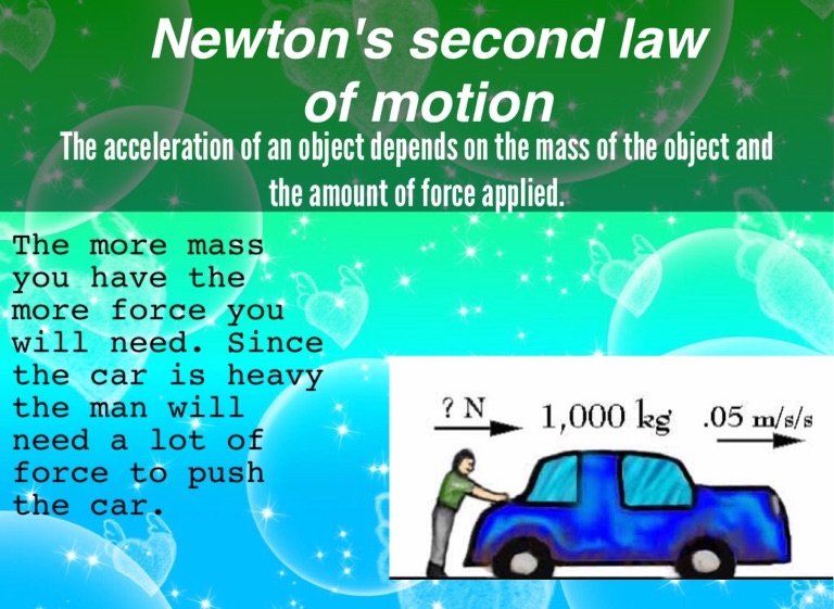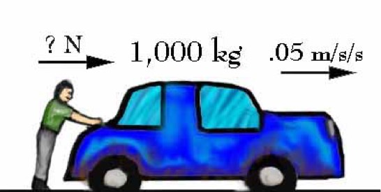 The more mass you have the more force you will need. Since the car is heavy the man will need a lot of force to push the car.