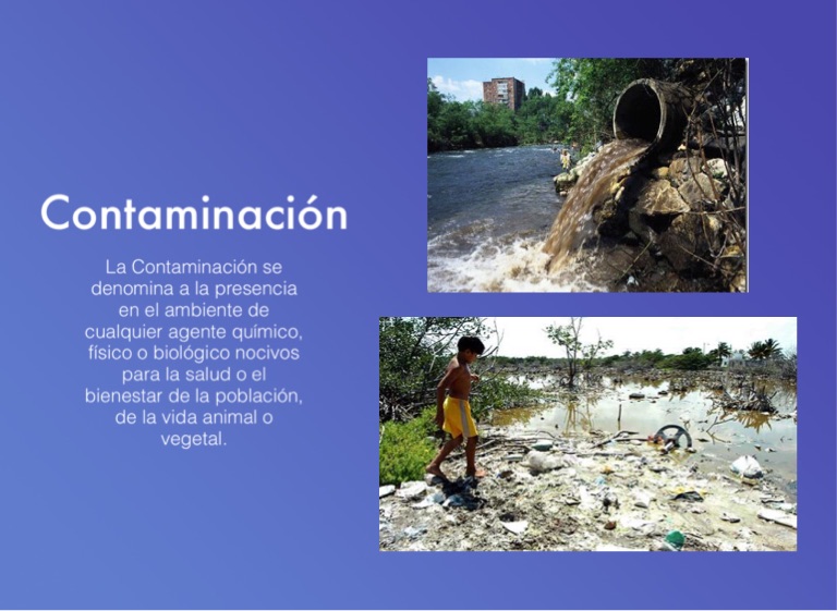 La Contaminación se denomina a la presencia en el ambiente de cualquier agente químico, físico o biológico nocivos para la salud o el bienestar de la población, de la vida animal o vegetal.