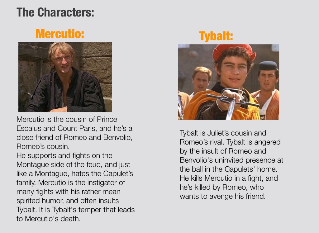 He supports and fights on the Montague side of the feud, and just like a Montague, hates the Capulet’s family. Mercutio is the instigator of many fights with his rather mean spirited humor, and often insults Tybalt. It is Tybalt's temper that leads to Mercutio's death.