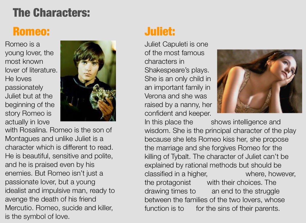 In this place the shows intelligence and wisdom. She is the principal character of the play because she lets Romeo kiss her, she propose the marriage and she forgives Romeo for the killing of Tybalt. The character of Juliet can’t be explained by rational methods but should be classified in a higher, where, however, the protagonist with their choices. The drawing times to an end to the struggle between the families of the two lovers, whose function is to for the sins of their parents.