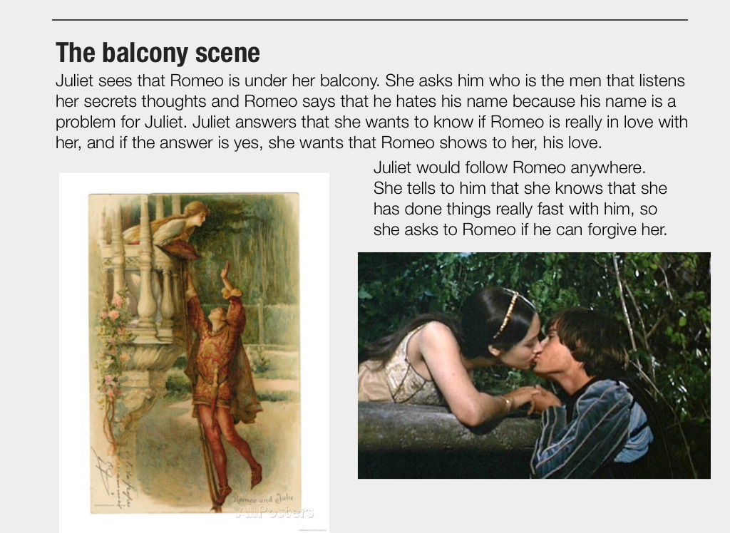 Juliet sees that Romeo is under her balcony. She asks him who is the men that listens her secrets thoughts and Romeo says that he hates his name because his name is a problem for Juliet. Juliet answers that she wants to know if Romeo is really in love with her, and if the answer is yes, she wants that Romeo shows to her, his love.