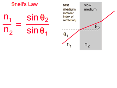 Snell's Law relates the indices of refraction n of the two media to the directions of propagation in terms of the angles to the normal. Snell's law can be derived from Fermat's Principle or from the Fresnel Equations.