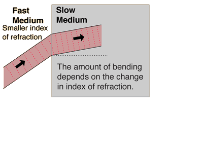 The amount of bending that a light ray experiences can be expressed in terms of the angle of refraction (more accurately, by the difference between the angle of refraction and the angle of incidence). A ray of light may approach the boundary at an angle of incidence of 45-degrees and bend towards the normal.