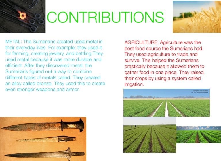 AGRICULTURE: Agriculture was the best food source the Sumerians had. They used agriculture to trade and survive. This helped the Sumerians drastically because it allowed them to gather food in one place. They raised their crops by using a system called irrigation.