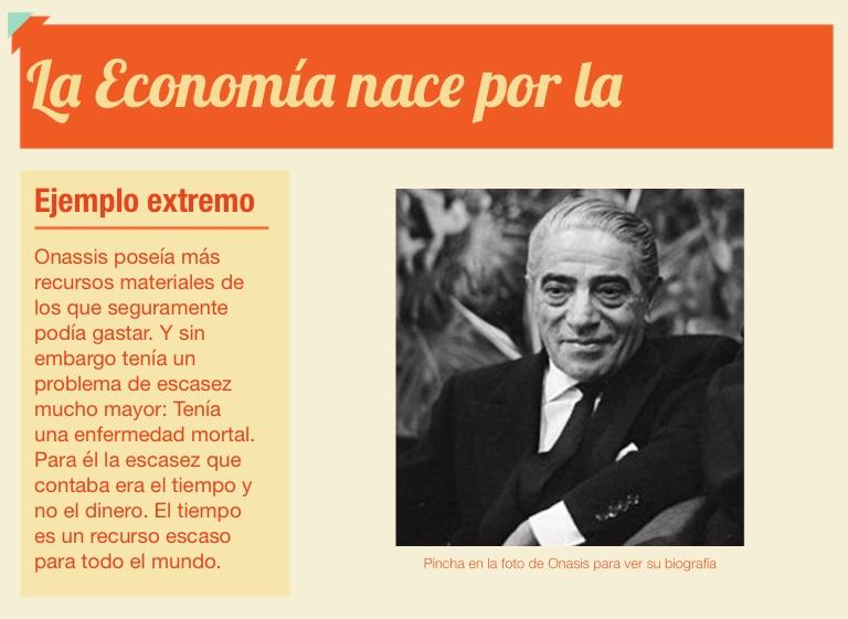 Onassis poseía más recursos materiales de los que seguramente podía gastar. Y sin embargo tenía un problema de escasez mucho mayor: Tenía una enfermedad mortal. Para él la escasez que contaba era el tiempo y no el dinero. El tiempo es un recurso escaso para todo el mundo.