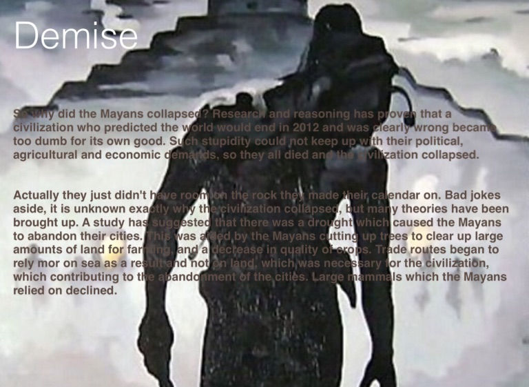 So why did the Mayans collapsed? Research and reasoning has proven that a civilization who predicted the world would end in 2012 and was clearly wrong became too dumb for its own good. Such stupidity could not keep up with their political, agricultural and economic demands, so they all died and the civilization collapsed.