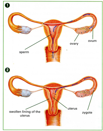 During sexual intercourse, a man deposits millions of sperm into a woman’s vagina. The sperm have tails, which help them to move. They travel from the vagina to the uterus and then up to the fallopian tubes.
