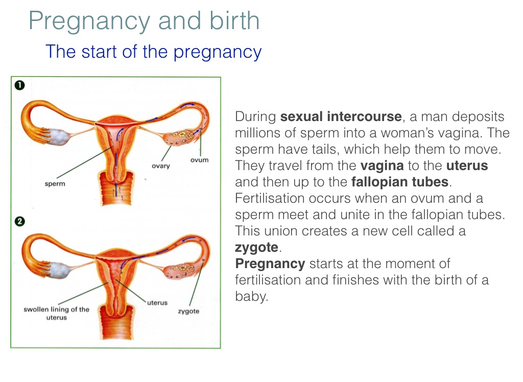 Pregnancy starts at the moment of fertilisation and finishes with the birth of a baby.