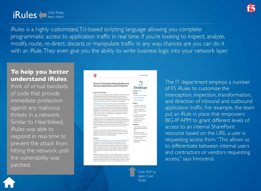 To help you better understand iRules, think of virtual bandaids of code that provide immediate protection against any malicious threats in a network. Similar to Heartbleed, iRules was able to respond in real-time to prevent the attack from hitting the network until the vulnerability was patched.