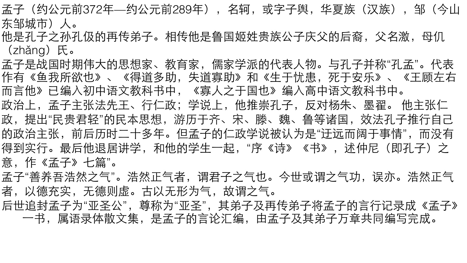 孟子是战国时期伟大的思想家、教育家,儒家学派的代表人物。与孔子并称“孔孟”。代表作有《鱼我所欲也》、《得道多助,失道寡助》和《生于忧患,死于安乐》、《王顾左右而言他》已编入初中语文教科书中,《寡人之于国也》编入高中语文教科书中。
