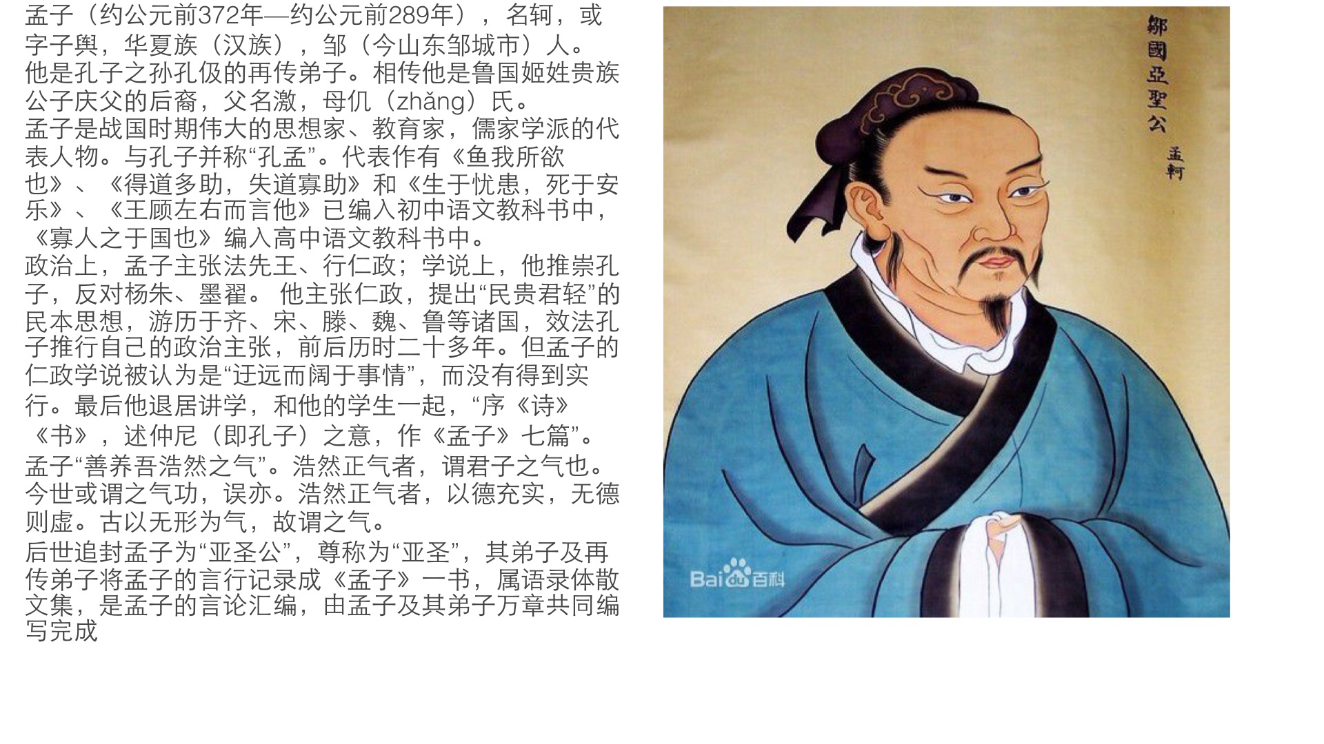 孟子是战国时期伟大的思想家、教育家,儒家学派的代表人物。与孔子并称孔孟。代表作有《鱼我所欲也》、《得道多助,失道寡助》和《生于忧患,死于安乐》、《王顾左右而言他》已编入初中语文教科书中,《寡人之于国也》编入高中语文教科书中。