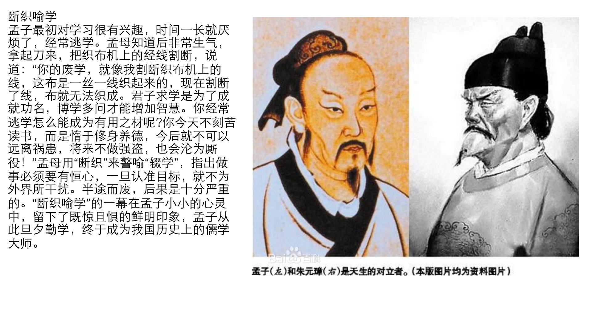 孟子最初对学习很有兴趣,时间一长就厌烦了,经常逃学。孟母知道后非常生气,拿起刀来,把织布机上的经线割断,说道:你的废学,就像我割断织布机上的线,这布是一丝一线织起来的,现在割断了线,布就无法织成。君子求学是为了成就功名,博学多问才能增加智慧。你经常逃学怎么能成为有用之材呢?你今天不刻苦读书,而是惰于修身养德,今后就不可以远离祸患,将来不做强盗,也会沦为厮役!孟母用断织来警喻辍学,指出做事必须要有恒心,一旦认准目标,就不为外界所干扰。半途而废,后果是十分严重的。断织喻学的一幕在孟子小小的心灵中,留下了既惊且惧的鲜明印象,孟子从此旦夕勤学,终于成为我国历史上的儒学大师。