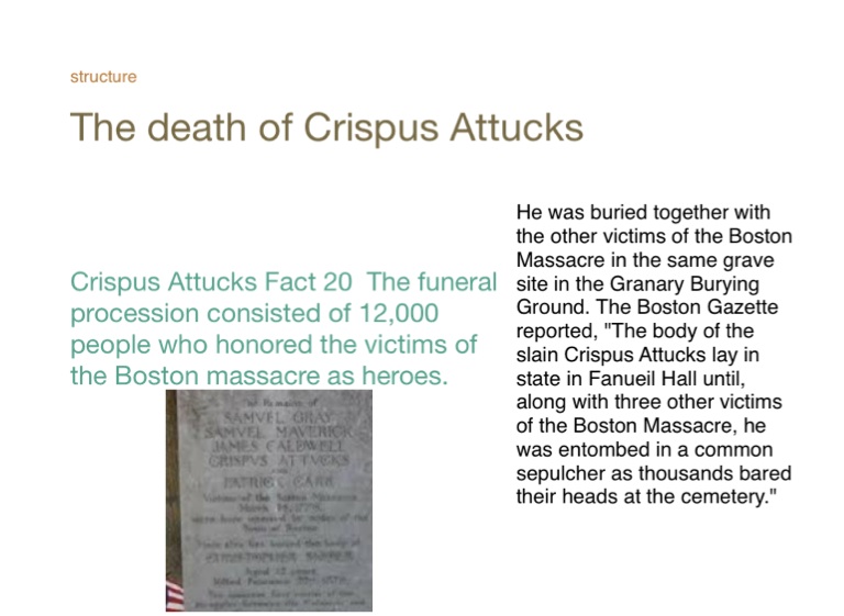 Crispus Attucks Fact 20The funeral procession consisted of 12,000 people who honored the victims of the Boston massacre as heroes.