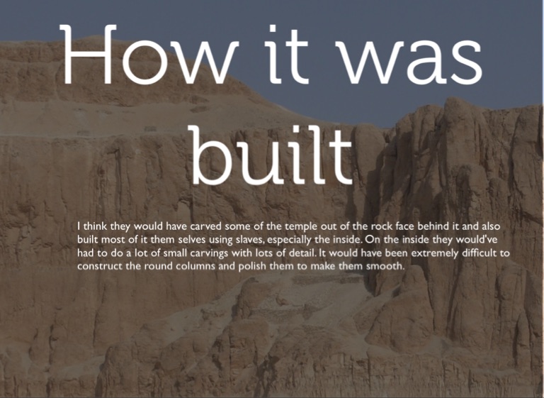 I think they would have carved some of the temple out of the rock face behind it and also built most of it them selves using slaves, especially the inside. On the inside they would've had to do a lot of small carvings with lots of detail. It would have been extremely difficult to construct the round columns and polish them to make them smooth.