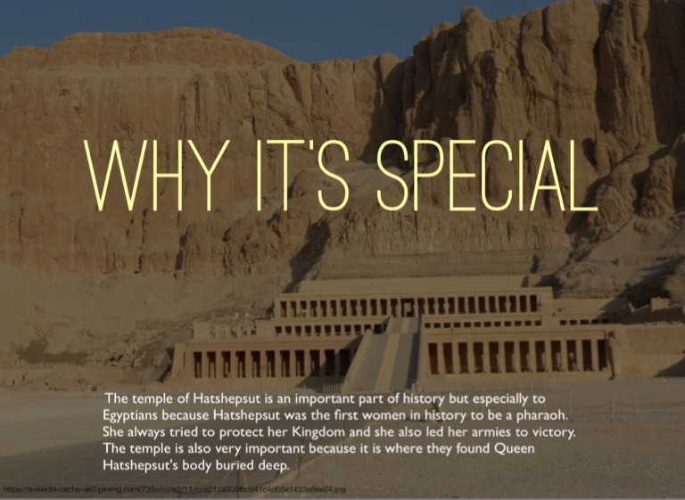 The temple of Hatshepsut is an important part of history but especially to Egyptians because Hatshepsut was the first women in history to be a pharaoh. She always tried to protect her Kingdom and she also led her armies to victory. The temple is also very important because it is where they found Queen Hatshepsut's body buried deep.