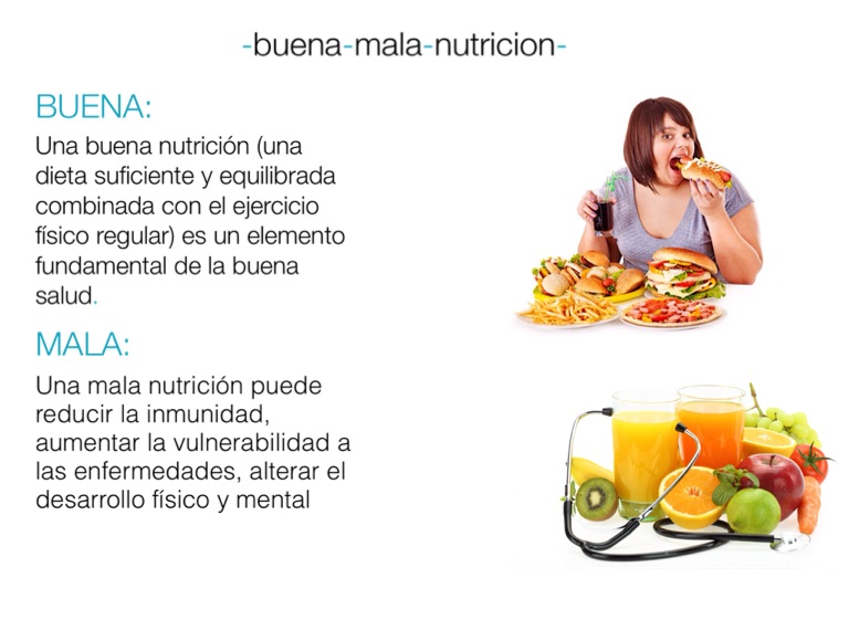 Una buena nutrición (una dieta suficiente y equilibrada combinada con el ejercicio físico regular) es un elemento fundamental de la buena salud.