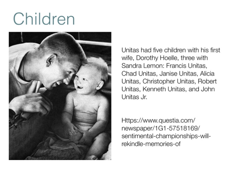Unitas had five children with his first wife, Dorothy Hoelle, three with Sandra Lemon: Francis Unitas, Chad Unitas, Janise Unitas, Alicia Unitas, Christopher Unitas, Robert Unitas, Kenneth Unitas, and John Unitas Jr.