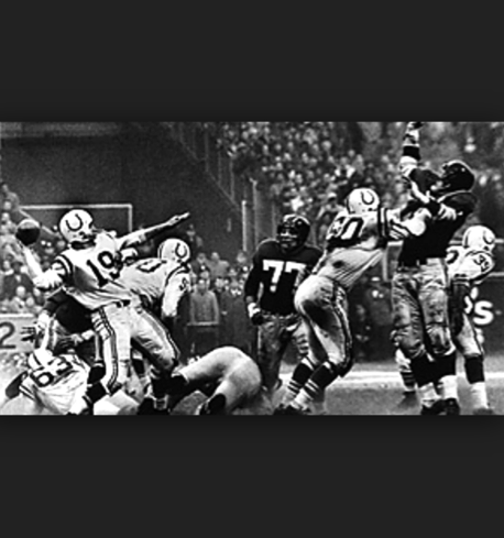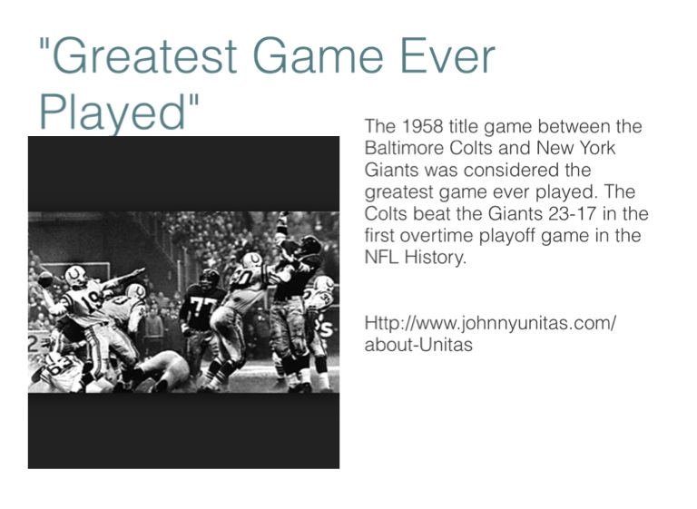 The 1958 title game between the Baltimore Colts and New York Giants was considered the greatest game ever played. The Colts beat the Giants 23-17 in the first overtime playoff game in the NFL History.