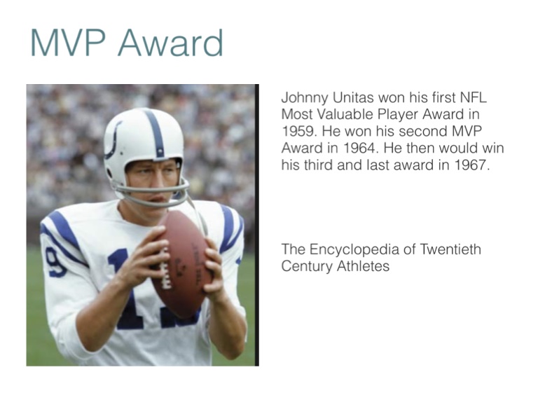 Johnny Unitas won his first NFL Most Valuable Player Award in 1959. He won his second MVP Award in 1964. He then would win his third and last award in 1967.