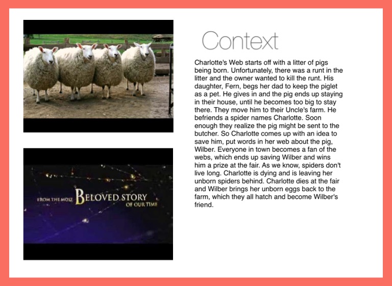 Charlotte's Web starts off with a litter of pigs being born. Unfortunately, there was a runt in the litter and the owner wanted to kill the runt. His daughter, Fern, begs her dad to keep the piglet as a pet. He gives in and the pig ends up staying in their house, until he becomes too big to stay there. They move him to their Uncle's farm. He befriends a spider names Charlotte. Soon enough they realize the pig might be sent to the butcher. So Charlotte comes up with an idea to save him, put words in her web about the pig, Wilber. Everyone in town becomes a fan of the webs, which ends up saving Wilber and wins him a prize at the fair. As we know, spiders don't live long. Charlotte is dying and is leaving her unborn spiders behind. Charlotte dies at the fair and Wilber brings her unborn eggs back to the farm, which they all hatch and become Wilber's friend.