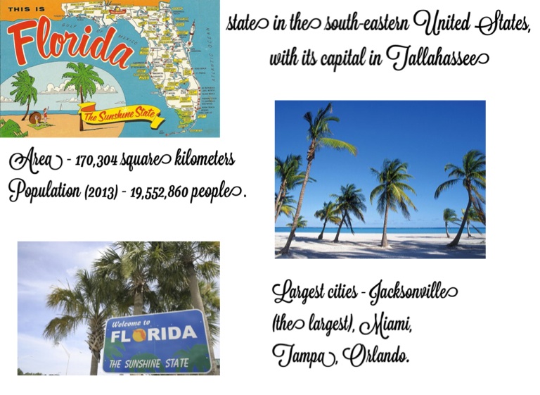 Largest cities - Jacksonville (the largest), Miami, Tampa, Orlando.