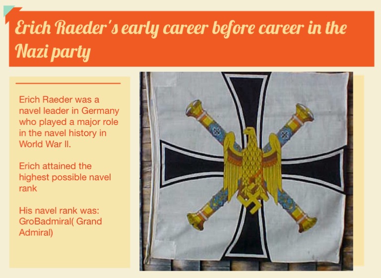 Erich Raeder was a navel leader in Germany who played a major role in the navel history in World War ll.