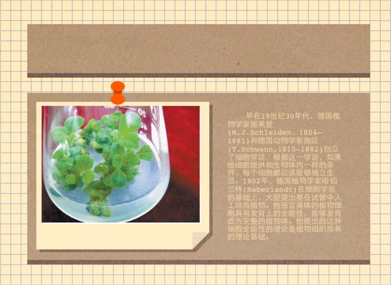 早在19世纪30年代,德国植物学家施莱登(M.J.Schleiden,1804—1881)和德国动物学家施旺(T.Schwann,1810—1882)创立了细胞学说,根据这一学说,如果给细胞提供和生物体内一样的条件,每个细胞都应该能够独立生活。1902年,德国植物学家哈伯兰特(Haberlandt)在细胞学说的基础上,大胆提出要在试管中人工培育植物。他预言离体的植物细胞具有发育上的全能性,能够发育成为完整的植物体。他提出的这种细胞全能性的理论是植物组织培养的理论基础。