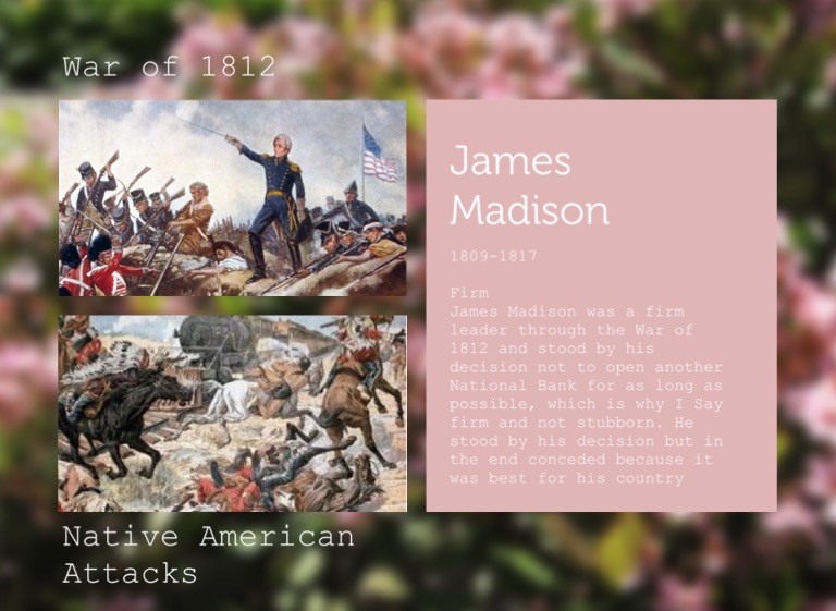 James Madison was a firm leader through the War of 1812 and stood by his decision not to open another National Bank for as long as possible, which is why I Say firm and not stubborn. He stood by his decision but in the end conceded because it was best for his country