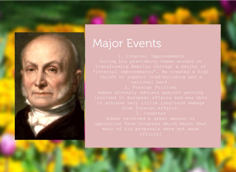 During his presidency Adams worked on transforming America through a series of "internal improvements". He created a high tariff to support road-building and a national bank.