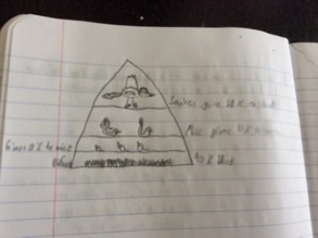 An energy pyramid is something that shows all the energy that flows through a food web. All the producers are at the bottom. The producers uses 90% of their energy and uses the other 10 for when it gets eaten. The primary consumers eat the producers and then the10% of leftover energy is passed on. The energy pyramid goes on when other consumers take over.