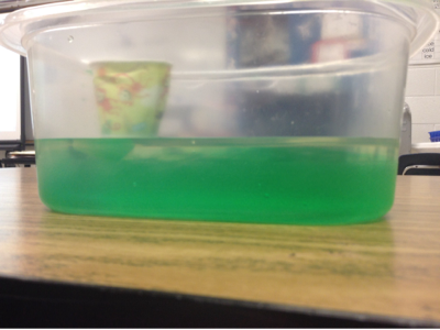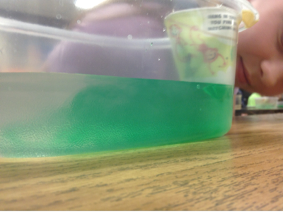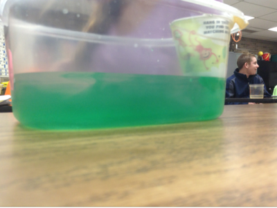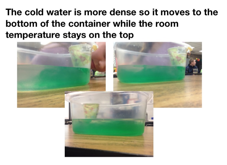 The cold water is more dense so it moves to the bottom of the container while the room temperature stays on the top
