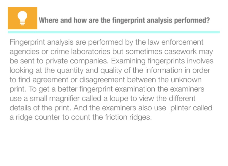 Fingerprint analysis are performed by the law enforcement agencies or crime laboratories but sometimes casework may be sent to private companies. Examining fingerprints involves looking at the quantity and quality of the information in order to find agreement or disagreement between the unknown print. To get a better fingerprint examination the examiners use a small magnifier called a loupe to view the different details of the print. And the examiners also use plinter called a ridge counter to count the friction ridges.