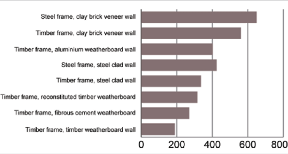 Source: Adapted from Lawson 1996. Indicative embodied energy content for some typical cladding systems