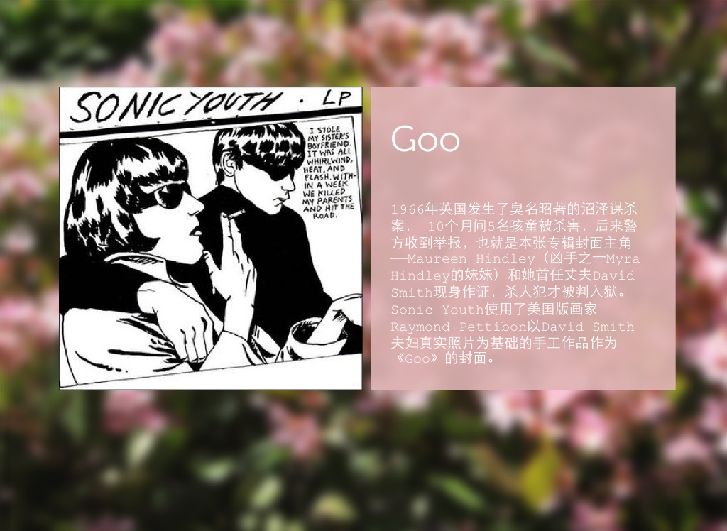 1966年英国发生了臭名昭著的沼泽谋杀案, 10个月间5名孩童被杀害,后来警方收到举报,也就是本张专辑封面主角——Maureen Hindley(凶手之一Myra Hindley的妹妹)和她首任丈夫David Smith现身作证,杀人犯才被判入狱。Sonic Youth使用了美国版画家Raymond Pettibon以David Smith夫妇真实照片为基础的手工作品作为《Goo》的封面。