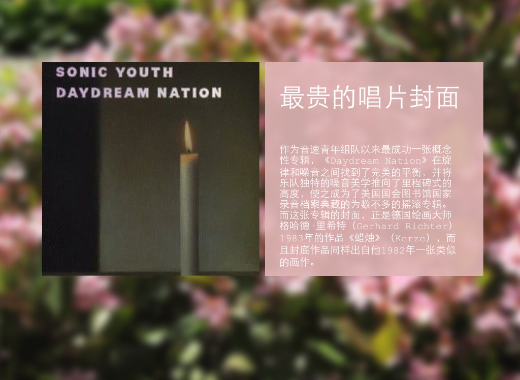 作为音速青年组队以来最成功一张概念性专辑,《Daydream Nation》在旋律和噪音之间找到了完美的平衡,并将乐队独特的噪音美学推向了里程碑式的高度,使之成为了美国国会图书馆国家录音档案典藏的为数不多的摇滚专辑。而这张专辑的封面,正是德国绘画大师格哈德·里希特(Gerhard Richter)1983年的作品《蜡烛》(Kerze),而且封底作品同样出自他1982年一张类似的画作。