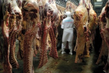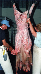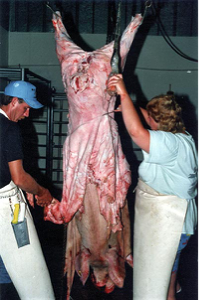 These photos show horrible working conditions of the meat industry. The top left picture shows a man in a uniform having to work within this room of dead animals. This job gives many men stress, depression, and sickness due to the rotting smell. The bottom left picture shows too people working without gloves on a dead animal, this once again shows how unenforced the laws are and how sick this job is.