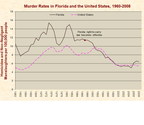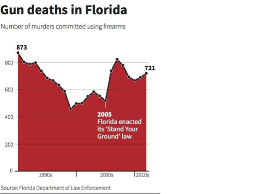 Gun deaths in Florida started out high in the 1990s and gradually declined throughout the decade and into the 2000s. Then, in 2005, when the stand your ground law was enacted, murders involving firearms spiked by more than 200 in two years.