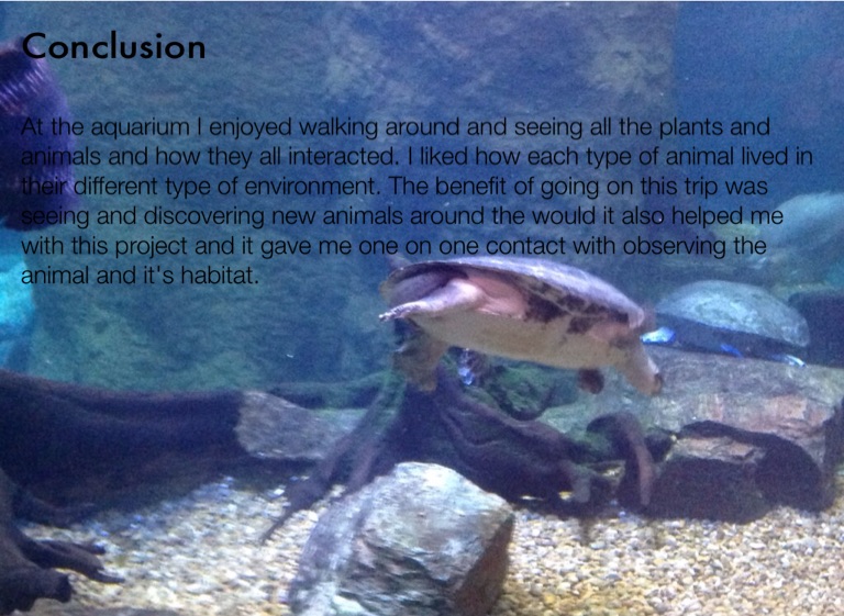 At the aquarium I enjoyed walking around and seeing all the plants and animals and how they all interacted. I liked how each type of animal lived in their different type of environment. The benefit of going on this trip was seeing and discovering new animals around the would it also helped me with this project and it gave me one on one contact with observing the animal and it's habitat.