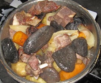 Horhog is a traditional Mongolian meat dish, which is very popular in camping and outdoor activities. It is not a dish for two. It should be made at least for 5 people. Horhog cooking is a lot of fun. It entails the spirit of togetherness and sets the beginnings of friendship. The cooking process is simple at first glance, however, it requires practice and intuition. Meat cut in large chunks is cooked with hot stones in a tightly closed aluminum can until it forms a hearty stew. When the cooking is done, the stones are taken out first and given to all horhog eaters. While still hot and greasy, stones should be rolled between palms or held with fingers. Rolling or holding stones with hands is supposed to be good for health because Mongolians believe that the heat and grease from just cooked meat eliminates fatigue and boosts stamina.