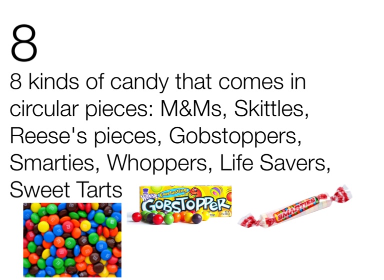8 kinds of candy that comes in circular pieces: M&Ms, Skittles, Reese's pieces, Gobstoppers, Smarties, Whoppers, Life Savers, Sweet Tarts