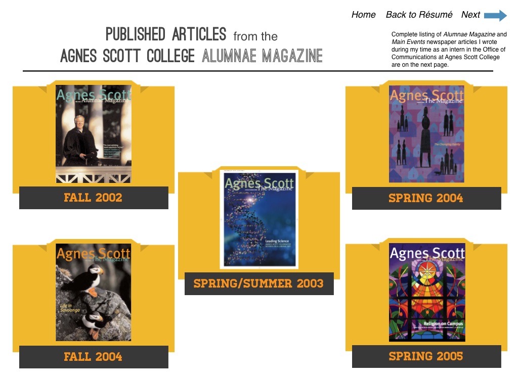 Complete listing of Alumnae Magazine and Main Events newspaper articles I wrote during my time as an intern in the Office of Communications at Agnes Scott College are on the next page.