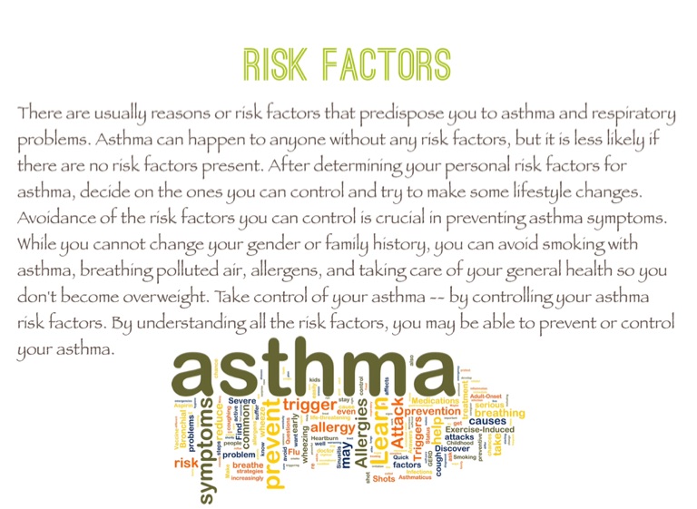 There are usually reasons or risk factors that predispose you to asthma and respiratory problems. Asthma can happen to anyone without any risk factors, but it is less likely if there are no risk factors present. After determining your personal risk factors for asthma, decide on the ones you can control and try to make some lifestyle changes. Avoidance of the risk factors you can control is crucial in preventing asthma symptoms. While you cannot change your gender or family history, you can avoid smoking with asthma, breathing polluted air, allergens, and taking care of your general health so you don't become overweight. Take control of your asthma -- by controlling your asthma risk factors. By understanding all the risk factors, you may be able to prevent or control your asthma.