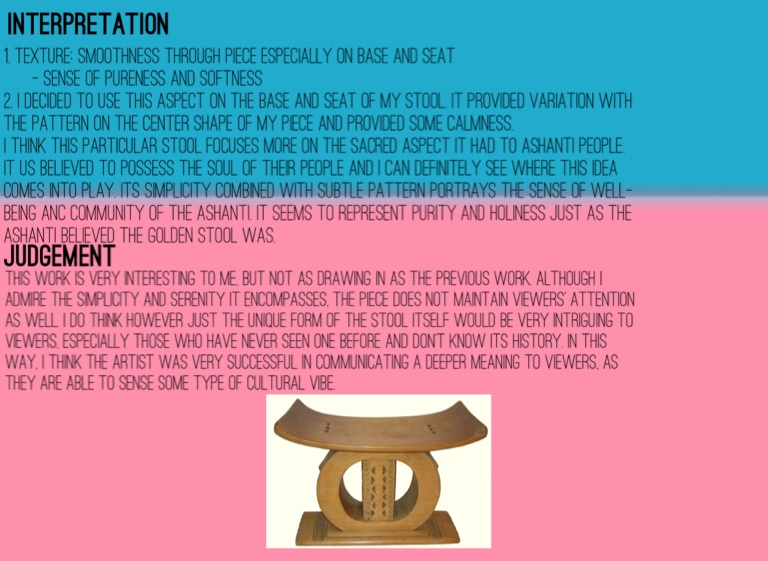 I think this particular stool focuses more on the sacred aspect it had to ashanti people. It us believed to possess the soul of their people and I can definitely see where this idea comes into play. Its simplicity combined with subtle pattern portrays the sense of well-being ANC community of the ashanti. It seems to represent purity and holiness just as the ashanti believed the golden stool was.