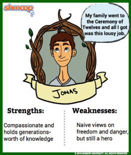 Jonas is the main character, he is the new receiver he holds all the memories of true pain and pleasure, he holds all the secrets and the community doesn't know anything, he is brave and humble, he keeps thinking about the truth and what to do.....