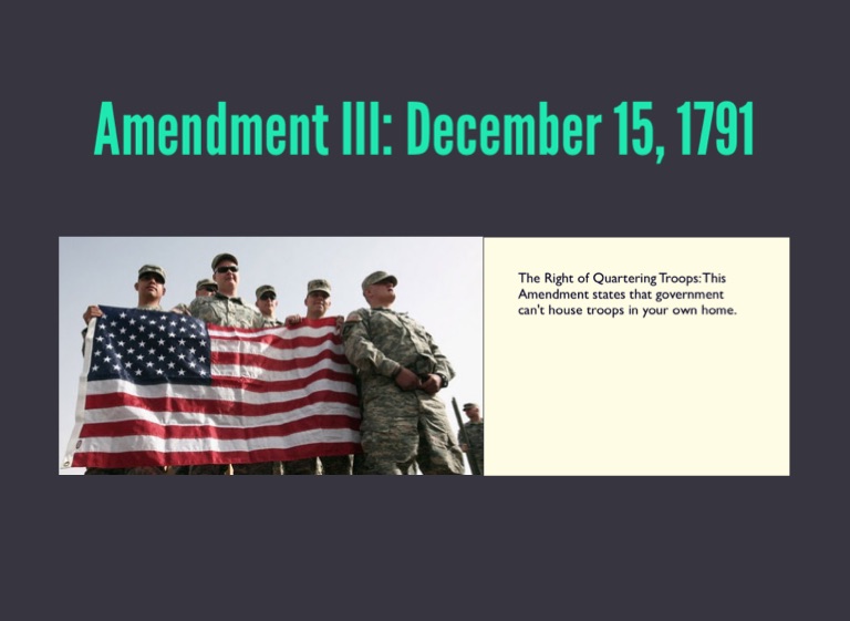 The Right of Quartering Troops: This Amendment states that government can't house troops in your own home.