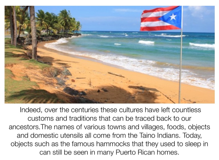 Indeed, over the centuries these cultures have left countless customs and traditions that can be traced back to our ancestors.The names of various towns and villages, foods, objects and domestic utensils all come from the Taino Indians. Today, objects such as the famous hammocks that they used to sleep in can still be seen in many Puerto Rican homes.