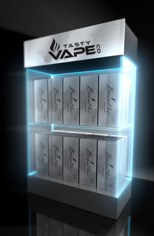 The perfect display for the perfect Vape. This high quality display is made of only the finest materials to showcase a one of a kind product. This Display is fully lined in led lights to really catch the consumers eye. Every time a patient walks into a dispensary their eyes immediately goes towards the Tasty Vape Logo that illuminated in true blue led lights