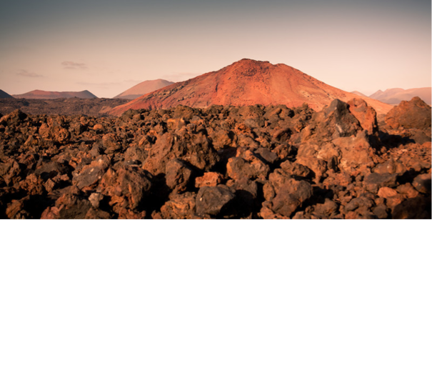 Es un paisaje rocoso, de un color rojizo por la lava o por los minerales que contiene la roca. Por lo que veo, está atardeciendo por el color del cielo y las sombras de las rocas. Hay unas cuantas nubes y un volcán o montaña al fondo