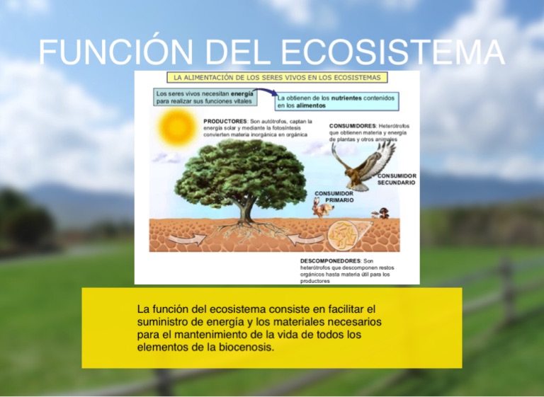 La función del ecosistema consiste en facilitar el suministro de energía y los materiales necesarios para el mantenimiento de la vida de todos los elementos de la biocenosis.